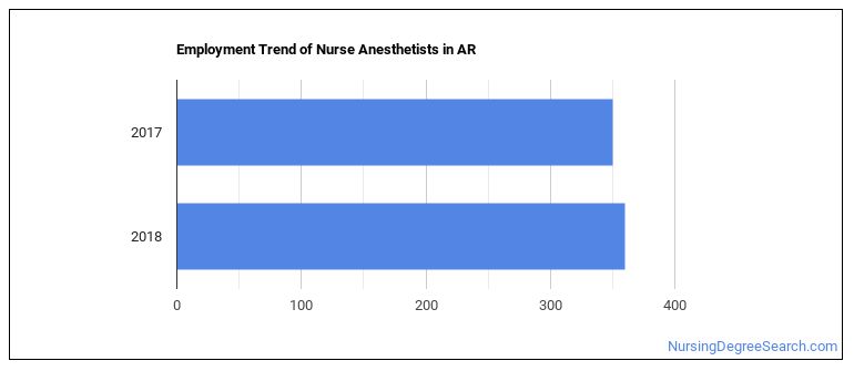 The BLS estimates 20 annual job openings, and a total of 400 jobs for Arkansas Nurse Anesthetists in 2026.