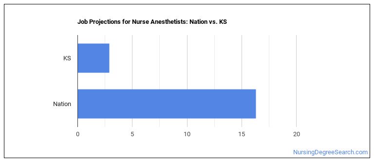 The BLS is projecting 20 annual Nurse Anesthetists job openings in Kansas, and 350 total jobs in the year 2026.