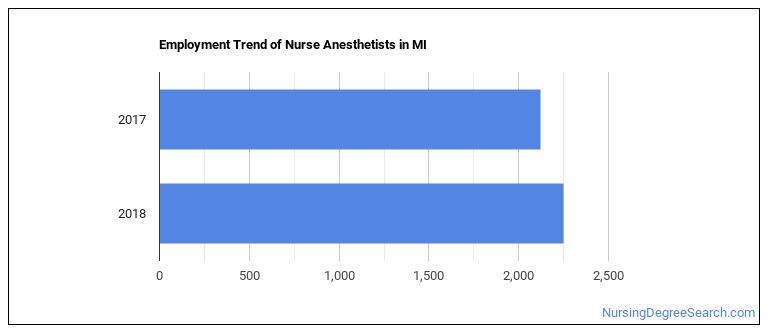 The BLS estimates 110 annual job openings, and a total of 2,110 jobs for Michigan Nurse Anesthetists in 2026.