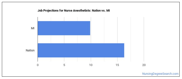 Projected employment for Nurse Anesthetists in Michigan is growing faster than average.