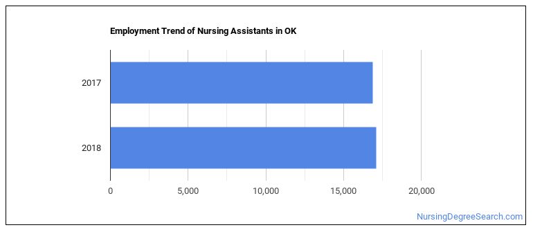 The BLS estimates 2,240 annual job openings, and a total of 19,680 jobs for Oklahoma Nursing Assistants in 2026.