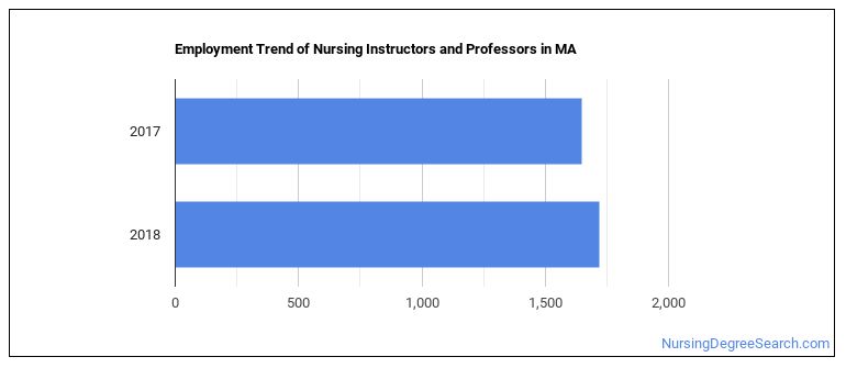 The BLS estimates 180 annual job openings, and a total of 2,020 jobs for Massachusetts Nursing Instructors and Professors in 2026.