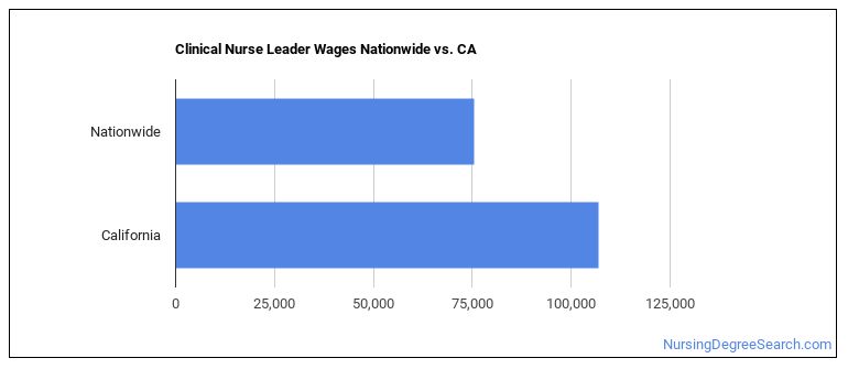 A typical salary for a clinical nurse leader grad in the state is $106,950, compared to a typical salary of $75,510 nationwide.