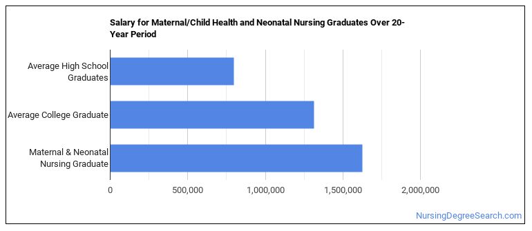 Average salaries range from $75,510 to $110,030 (25th to 75th percentile) for careers related to maternal/child health and neonatal nursing. This range includes all degree levels, so the salary for a person with just a bachelor’s degree may be a little less and the one for a person with an advanced degree may be a little more.