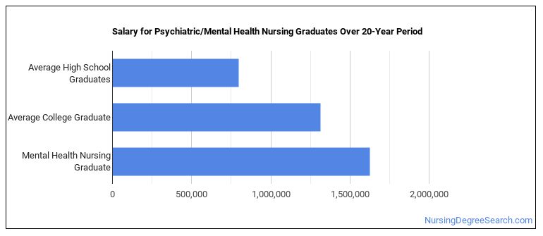 Psychiatric/Mental Health Nursing majors often go into careers where salaries can range from $75,510 to $110,030 (25th to 75th percentile). This range includes all degree levels, so the salary for a person with just a bachelor’s degree may be a little less and the one for a person with an advanced degree may be a little more.