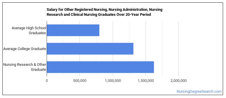 Average salaries range from $75,510 to $110,030 (25th to 75th percentile) for careers related to other registered nursing, nursing administration, nursing research and clinical nursing. This range includes all degree levels, so the salary for a person with just a bachelor’s degree may be a little less and the one for a person with an advanced degree may be a little more.