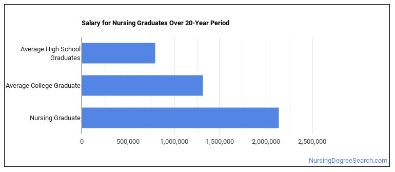 The median salary for a nursing grad is $106,910 per year. This is based on the weighted average of the most common careers associated with the major.
